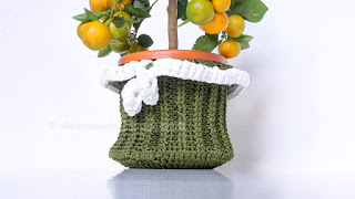 Realizzato ad uncinetto a maglia bassa in rilievo e maglia bassa in costa dietro, con cordino thai verde militare, e rifinito con fettuccia bianca.