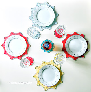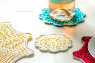 E' molto simpatico e vivace questo set da tavola multicolor composto da sottopiatti, sottobicchieri e sottobottiglia lavorati ad uncinetto. La rifinitura con il filo argentato darà una piccola nota natalizia in questo periodo.